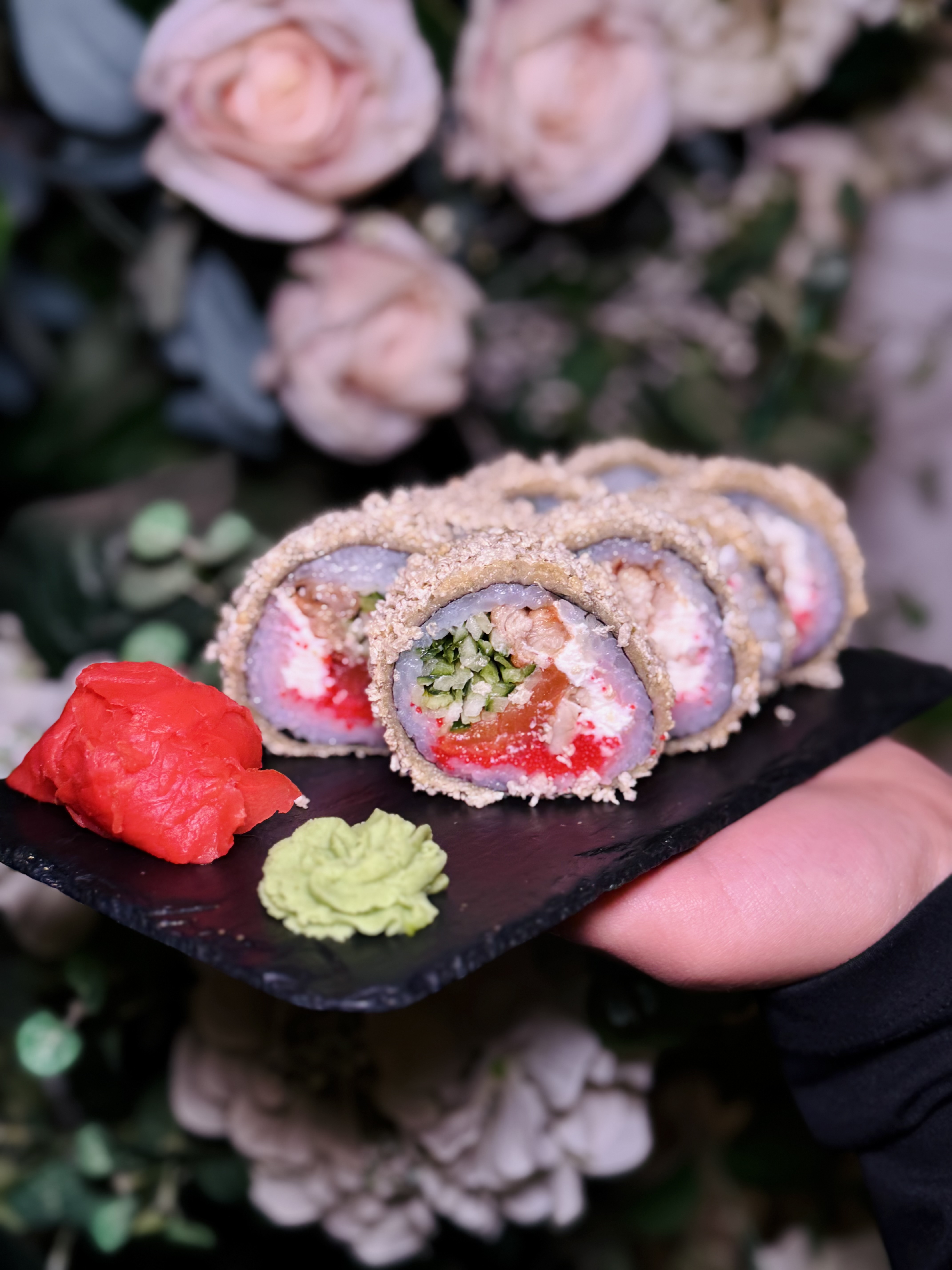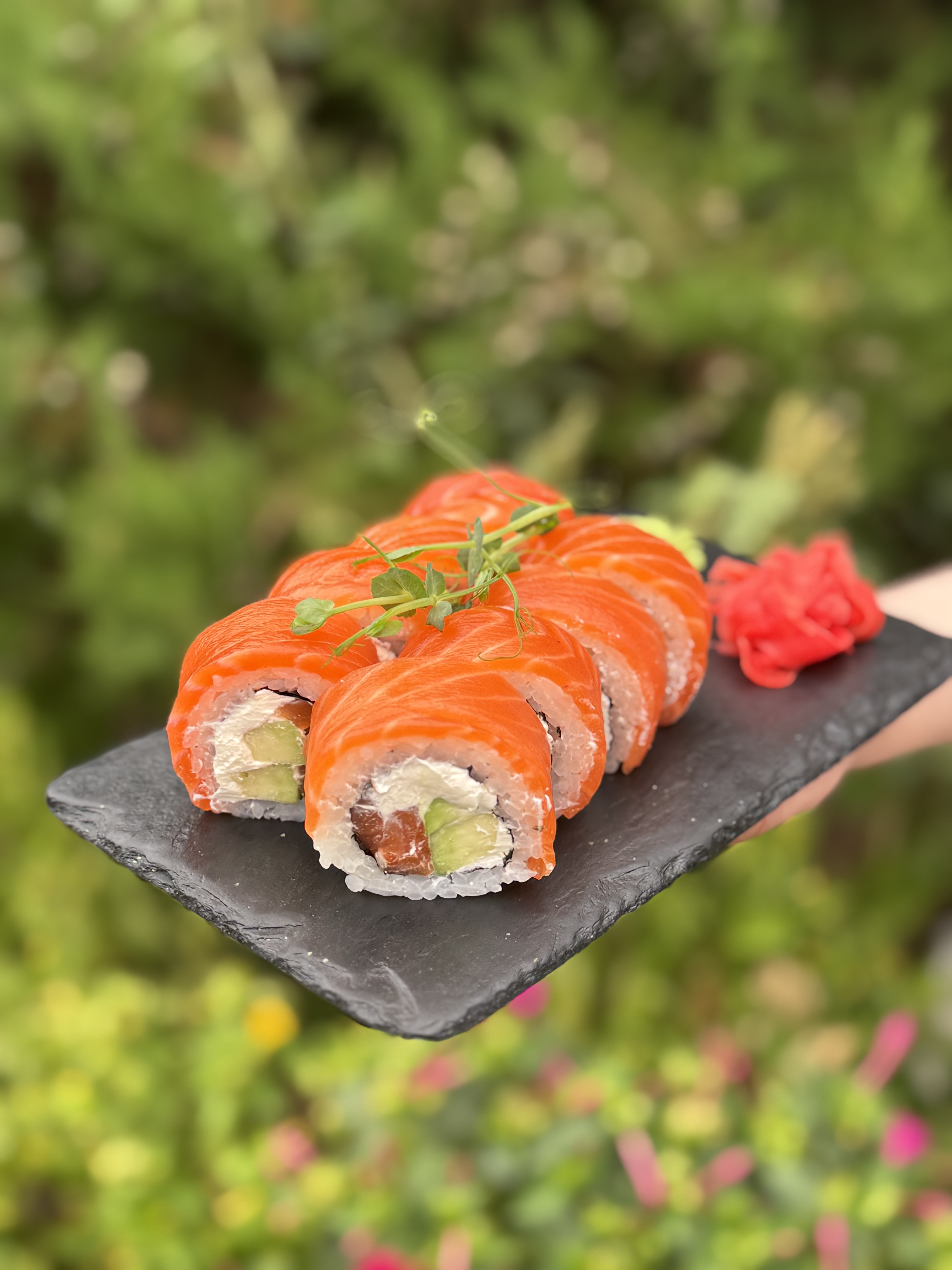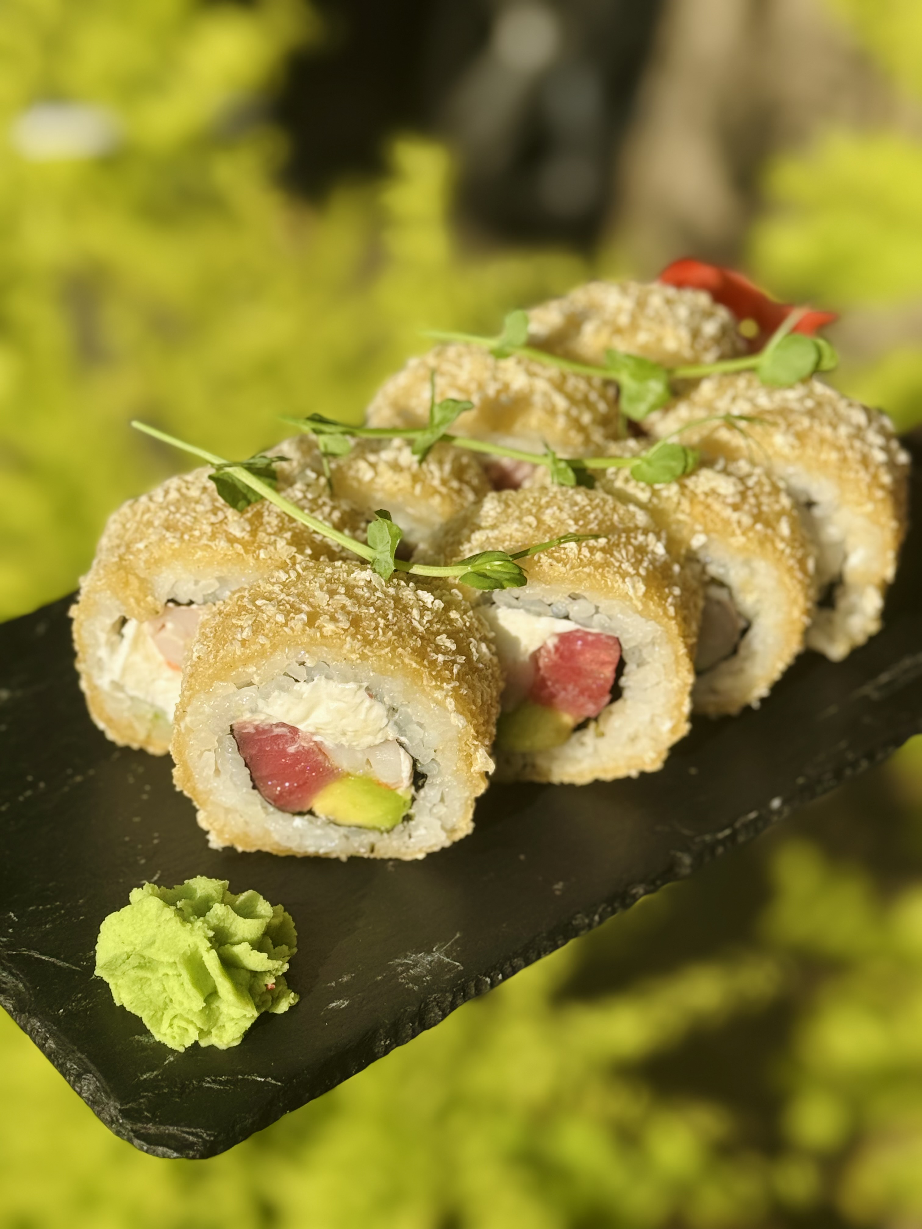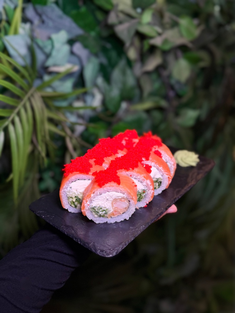 -Рол з тунцем і грушею у стружці норі.-Каліфорнія з креветкою темпура у тобіку.-Філадельфія зі смаженим лососем у кунжуті.