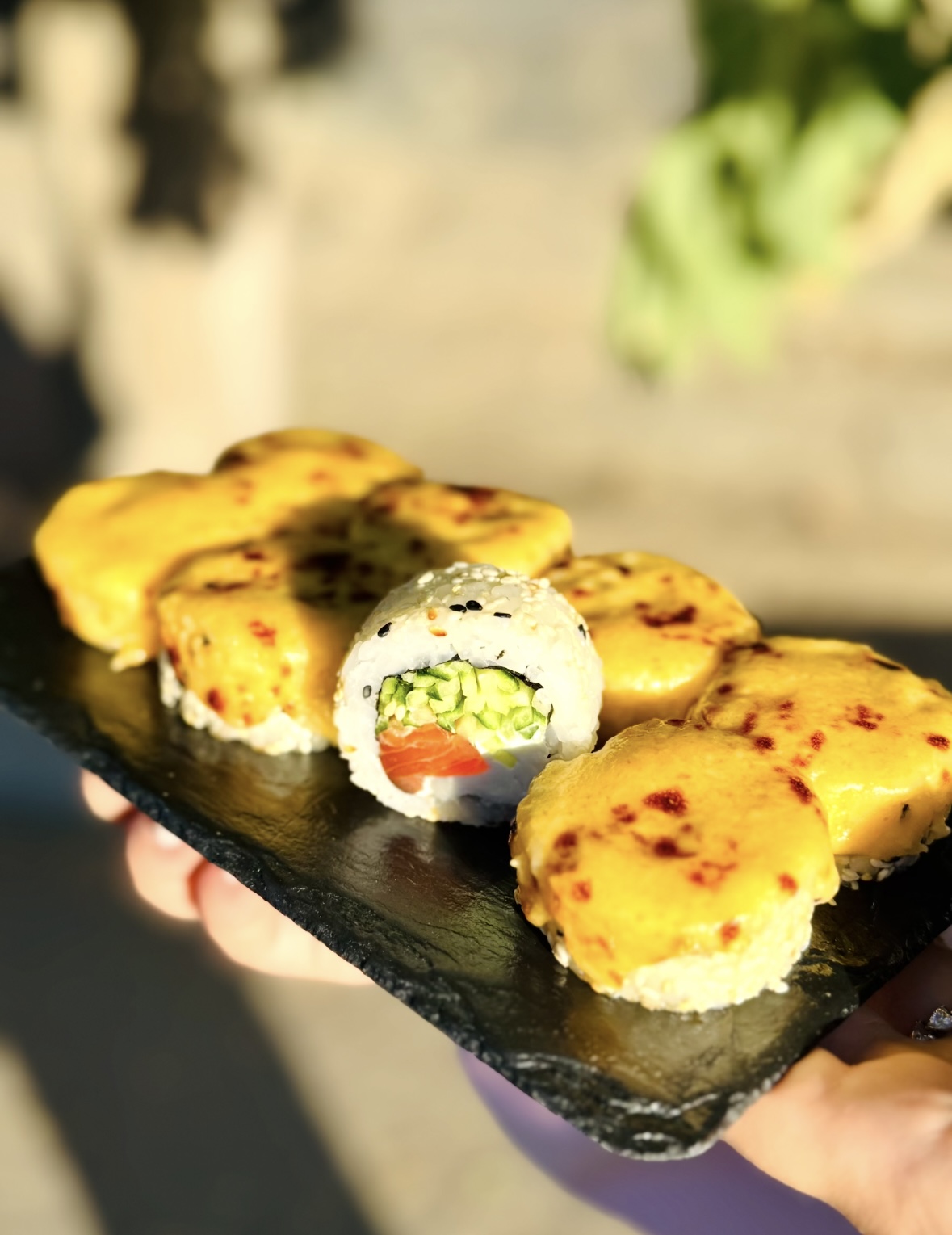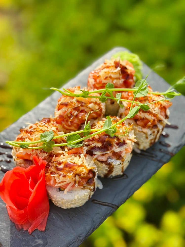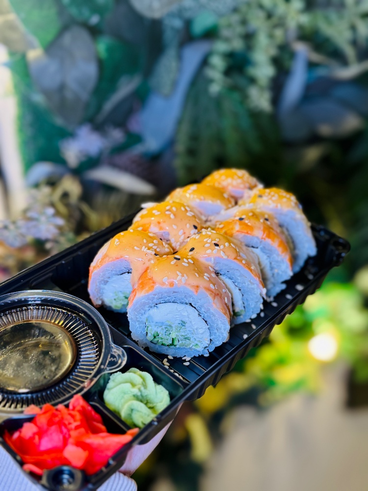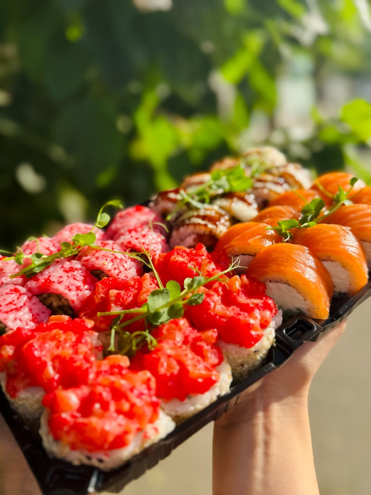-Рол з тунцем і грушею у стружці норі.-Каліфорнія з креветкою темпура у тобіку.-Філадельфія зі смаженим лососем у кунжуті.